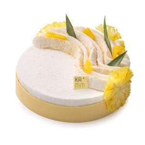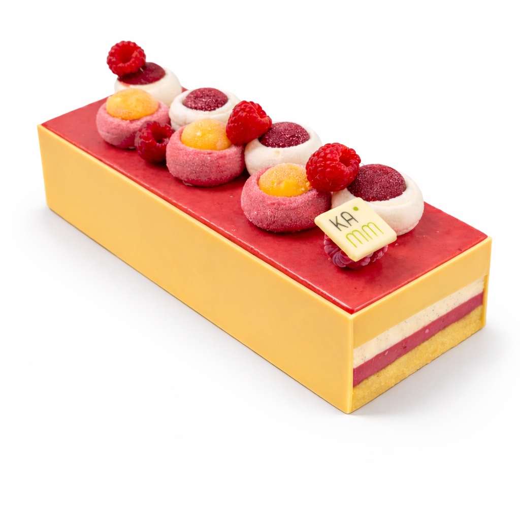 Sorbet framboise, sorbet fruits de la passion, crème glacée Vanille de Madagascar, biscuit moelleux aux amandes.